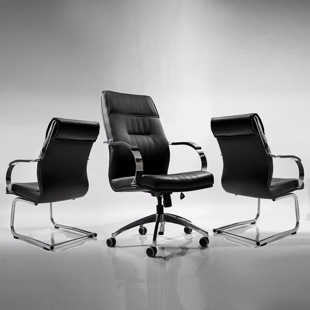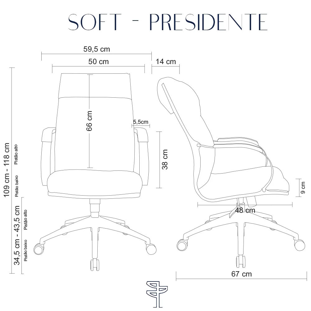 ** Conjunto contém: 1 poltrona Soft presidente e 2 poltronas Soft diretor.Capacidade de peso: 150 Kg;Revestimento em couríssimo automotivo;Aranha com capacidade para 1100 Kg;Rodízio de duplo giro ABNT 13962;Concha em madeira compensada de 20mm;Espuma de alta densidade D33 ABNT 13579;Braço em chapa de aço cromado com apoio em polipropileno;Fixação do braço no assento e no encosto não permitindo quebra;Pistão a gás;Mecanismo relax com trava.Base fixa pé em "S" em tubo de aço 1.1/4 cromado;